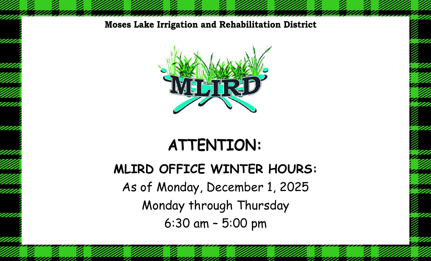12, 2025 at 5:00 p.m. in the MLIRD Boardroom at 932 E. Wheeler Rd. Moses Lake,